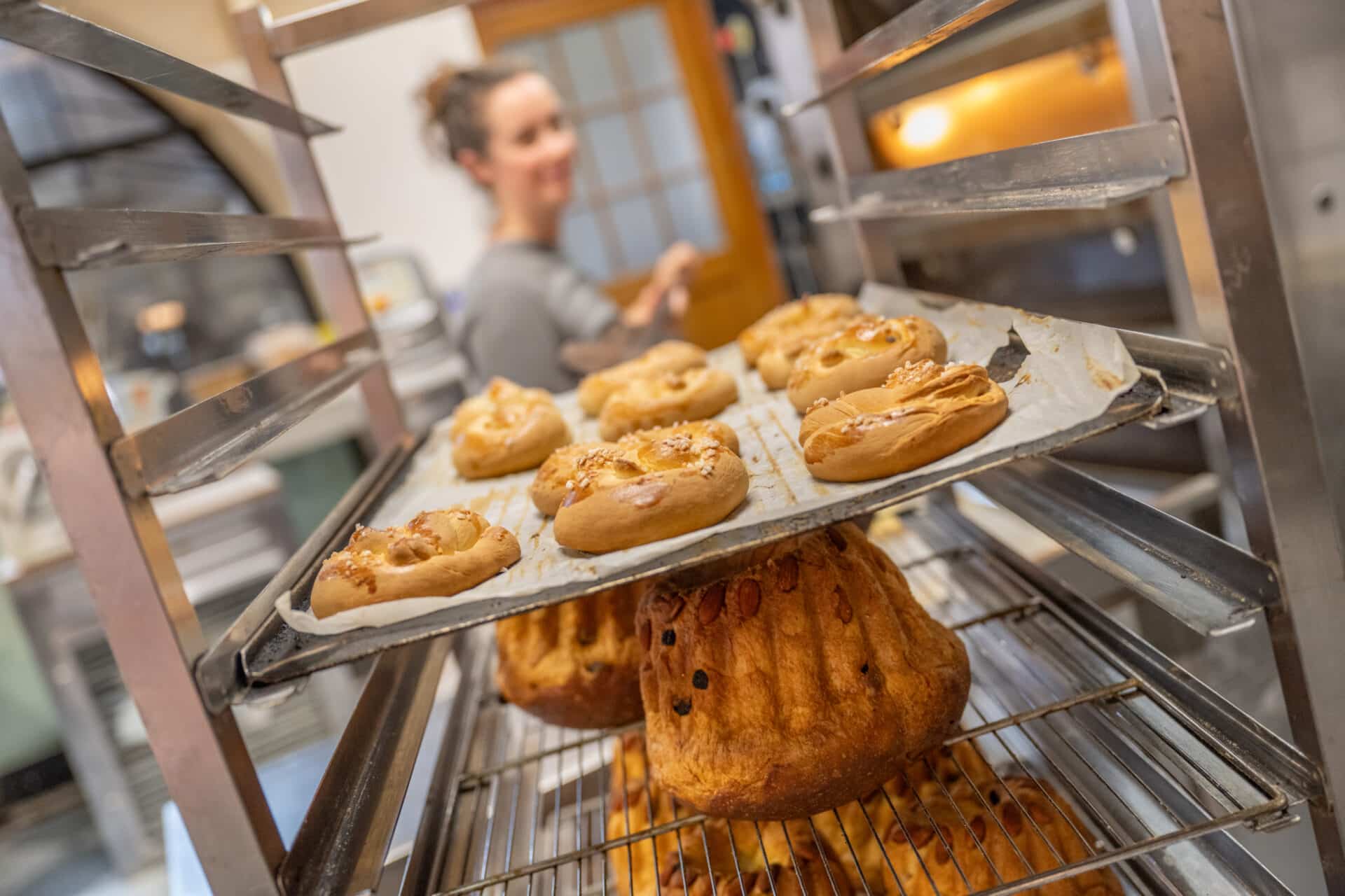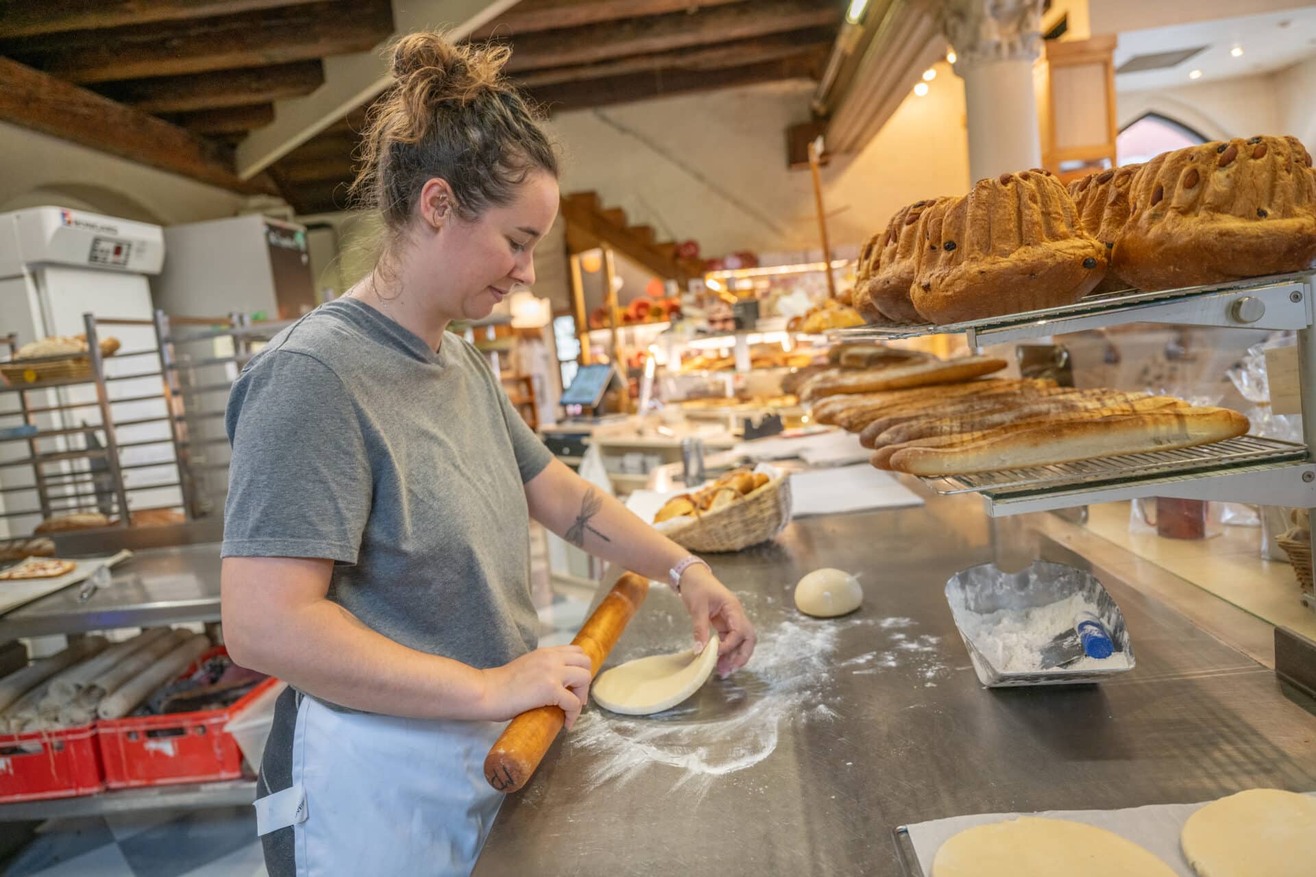 Au cœur du fournil, les boulangers façonnent à la main pains spéciaux, kougelhopfs, bretzels et autres douceurs.