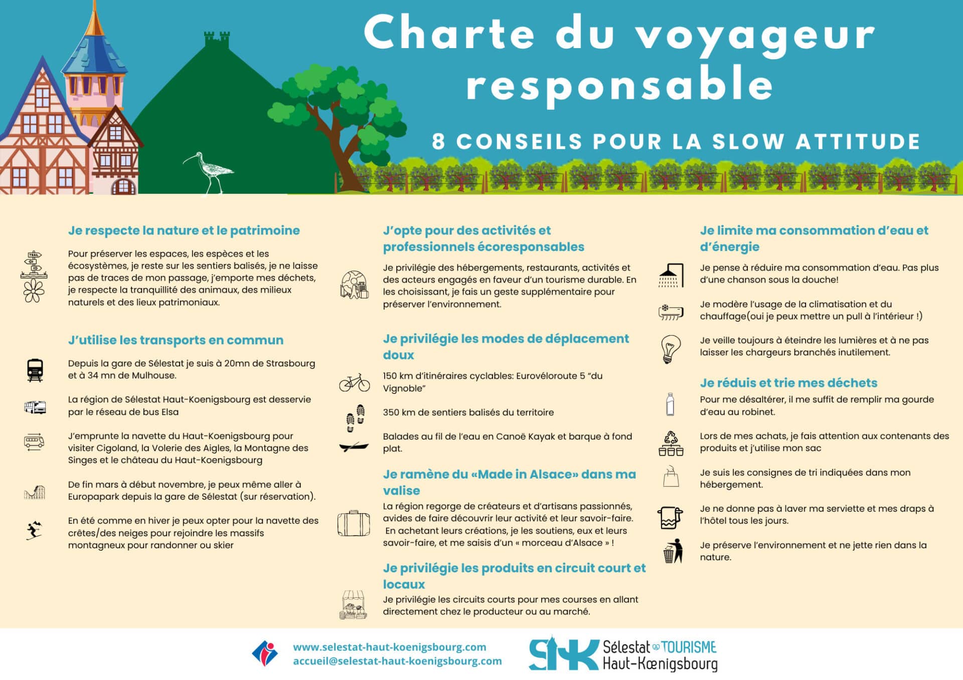 Sélestat Haut-Koenigsbourg Tourisme invite ses voyageurs à adopter la bonne attitude. Découvrez notre charte du voyageur responsable en cliquant sur l'image. Des engagements à partager, pour profiter pleinement de ses vacances, aujourd’hui et demain, dans la région de Sélestat Haut-Koenigsbourg !